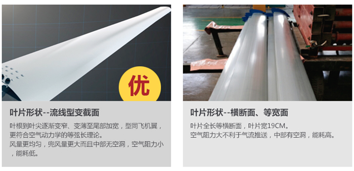 更符合空氣動力學的等弦長理論,沿葉片長度方向從葉根到葉尖向下送風的風量更均勻,且中部無空洞,風阻小、高能效。